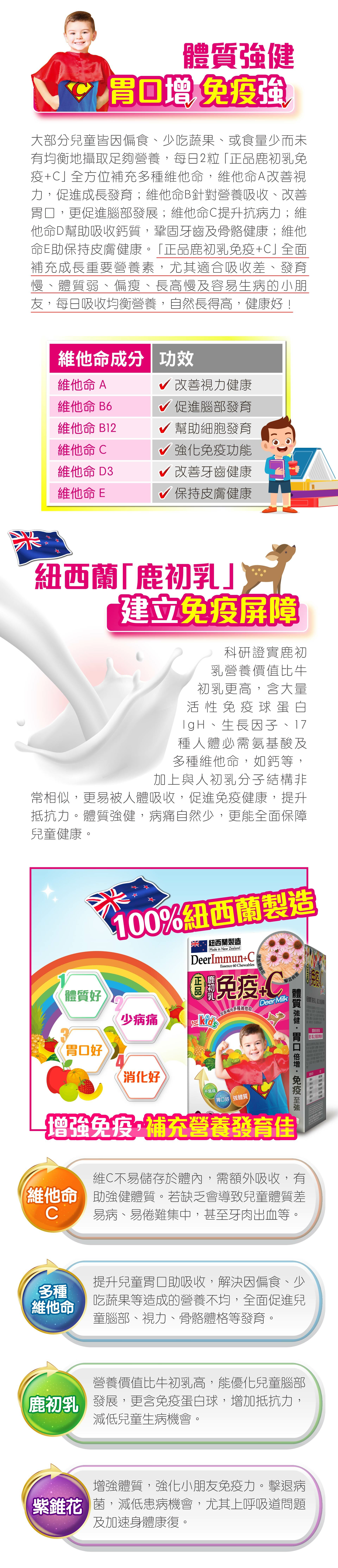 醫學研究指兒童處於黃金發育時期,需要吸收大量的營養素。而部份營養素是人體自身所不能合成的或長期貯藏的,必需不斷地補充。優質紐西蘭「鹿初乳免疫+C」為兒童提供維他命A-E多種營養素供成長所需,幫助小朋友發育好、易長高,體格更強健,更加入紫錐花,進一步提升免疫力,小朋友自然健康不易病!