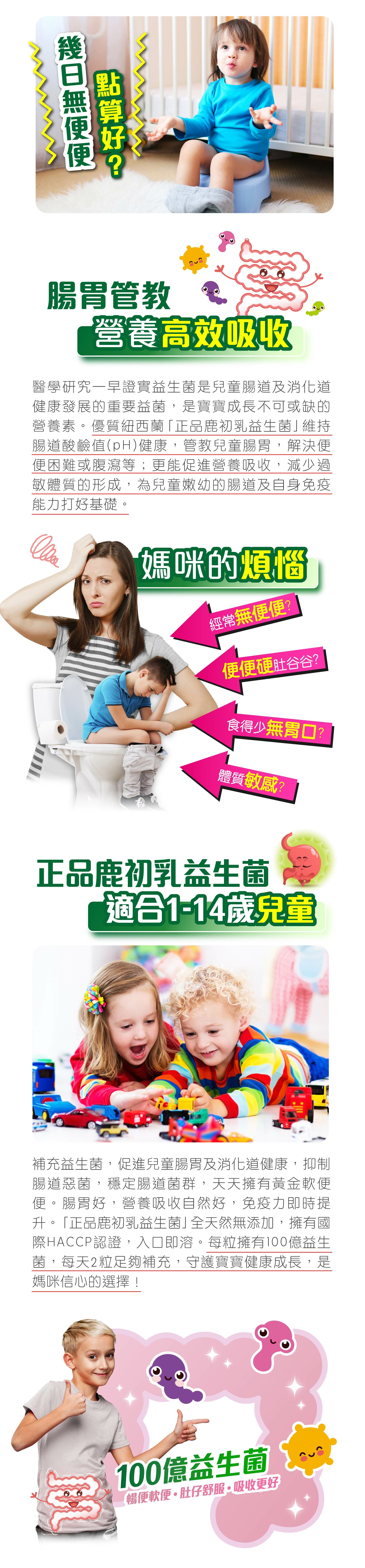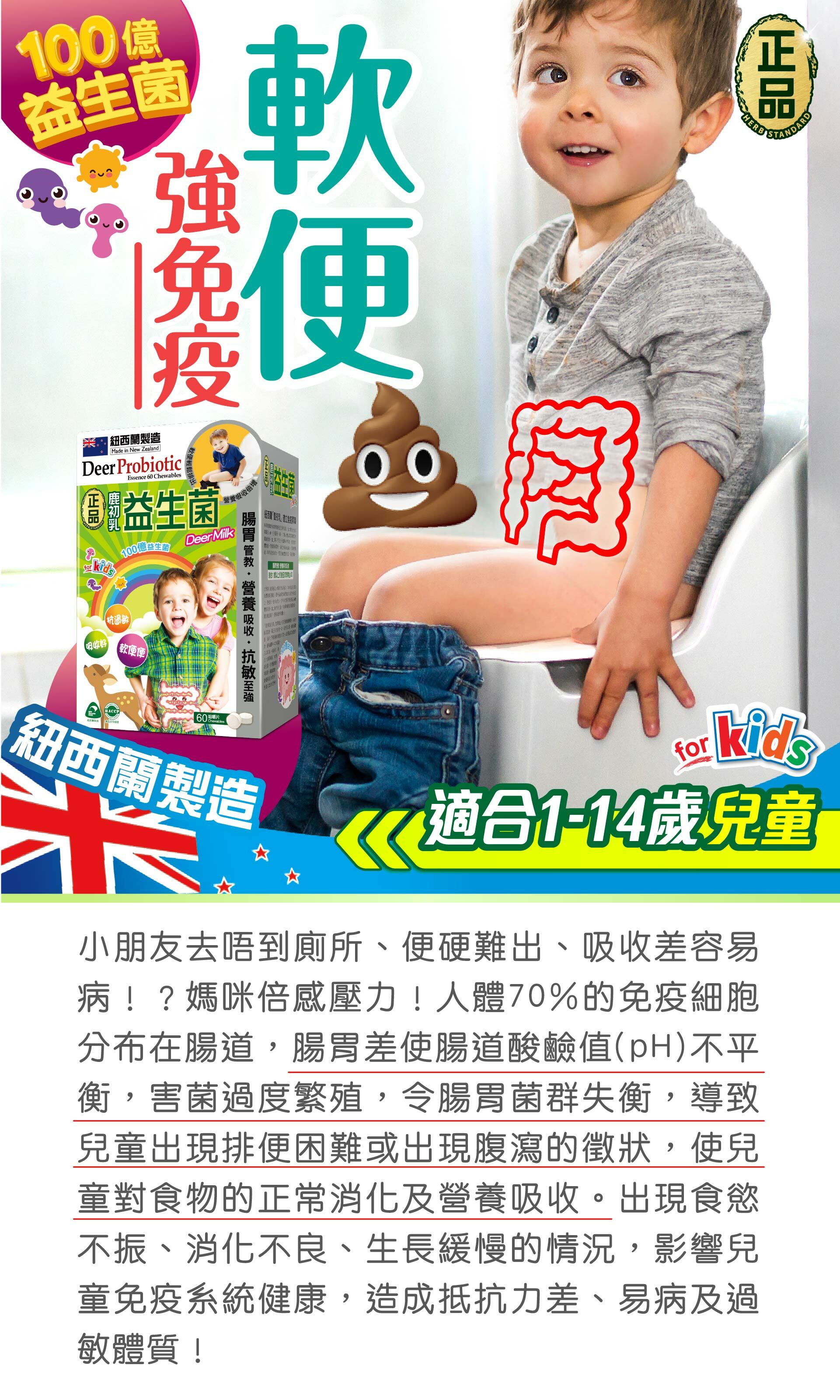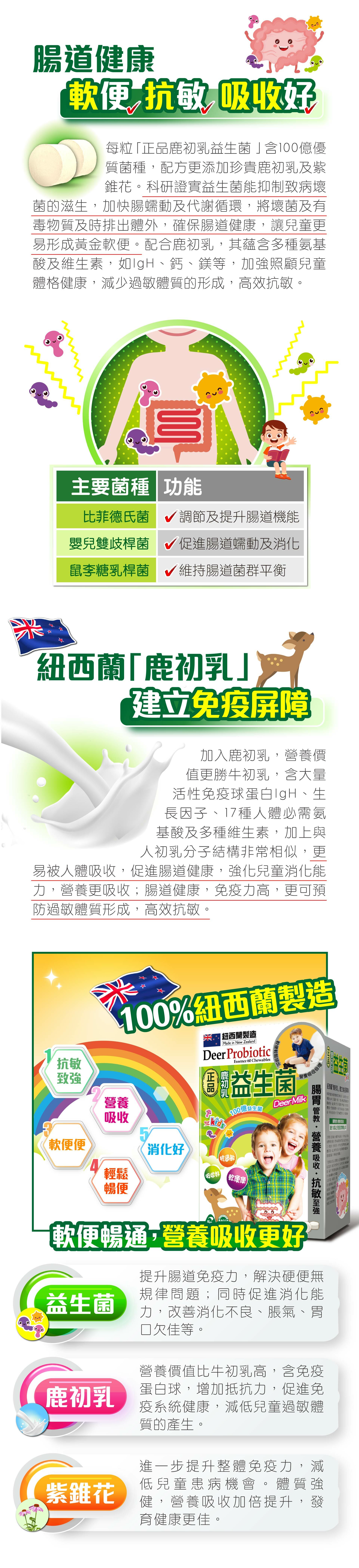 醫學研究一早證實益生菌是兒童腸道及消化道健康發展的重要益菌,是寶寶成長不可或缺的營養素。優質紐西蘭「鹿初乳益生菌」維持腸道酸鹼值(pH)健康,管教兒童腸胃,解決便便困難或腹瀉等;更能促進營養吸收,減少過敏體質的形成,為兒童嫩幼的腸道及自身免疫能力打好基礎。