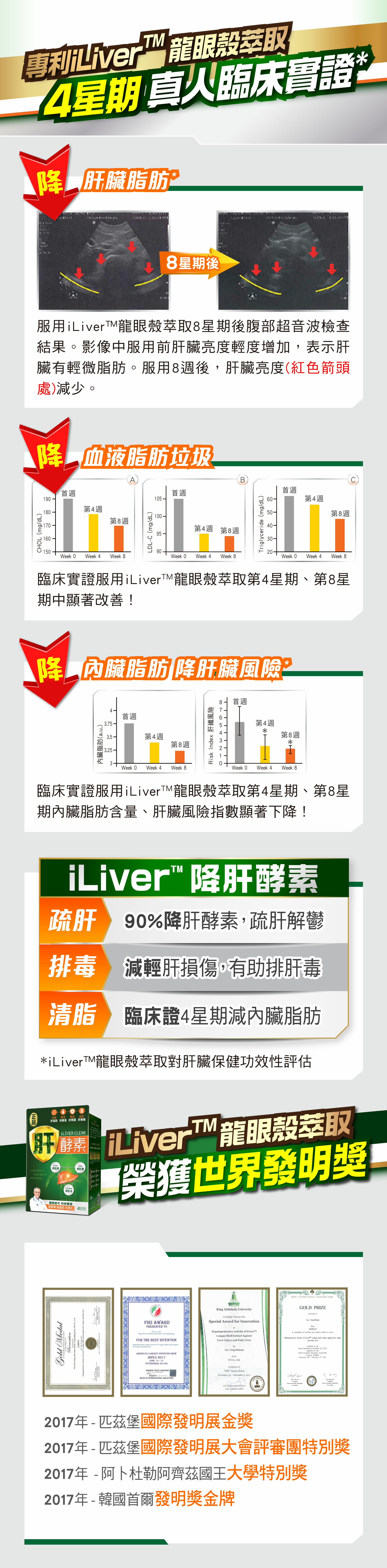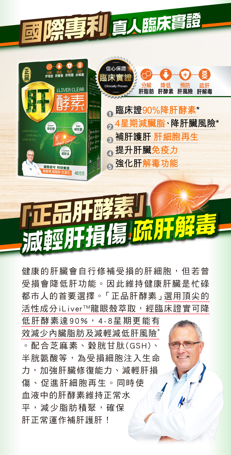 「正品肝酵素」選用頂尖的活性成分-iLiverTM龍眼殼萃取,經臨床證實可降低肝酵素達90%,4-8星期更能有效減少內臟脂肪及肝風險*。配合芝麻素、穀胱甘肽(GSH)、半胱氨酸等,為受損細胞注入生命力,加強肝臟修復能力、減輕肝損傷、促進肝細胞再生。同時使血液中的肝酵素維持正常水準,減少脂肪積聚,確保肝正常運作,補肝護肝! *iLiverTM龍眼殼萃取對肝臟保健功效性評估。