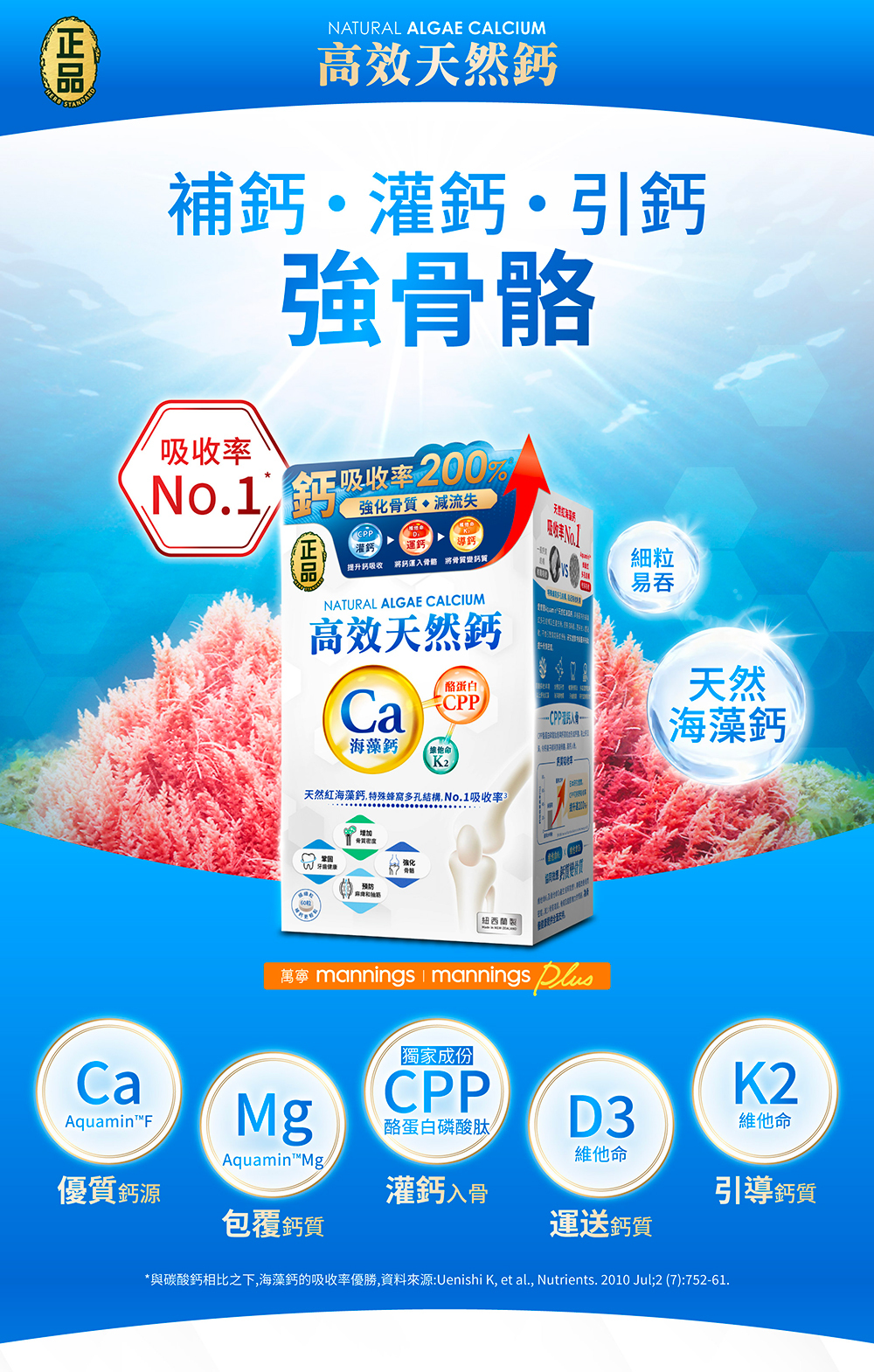正品高效天然鈣源自愛爾蘭Aquamin天然紅海藻鈣,每年限產,其獨特多孔結構,能提高溶解度,吸收率達200%^,輔以Aquamin紅海藻鎂(Mg),提升吸收穩定,能易被人體吸收。配方結合獨特成分「酪蛋白磷酸肽」(CPP),加上維他命D3及維他命K2產生的協同效應之下*; CPP有效防止鈣沉澱,維他命D3增強腸道鈣質吸收,維他命K2引導鈣質注入,將鈣質變骨質。高效補鈣入骨,預防骨質疏鬆及支持長期骨骼健康,一家大細都啱食。