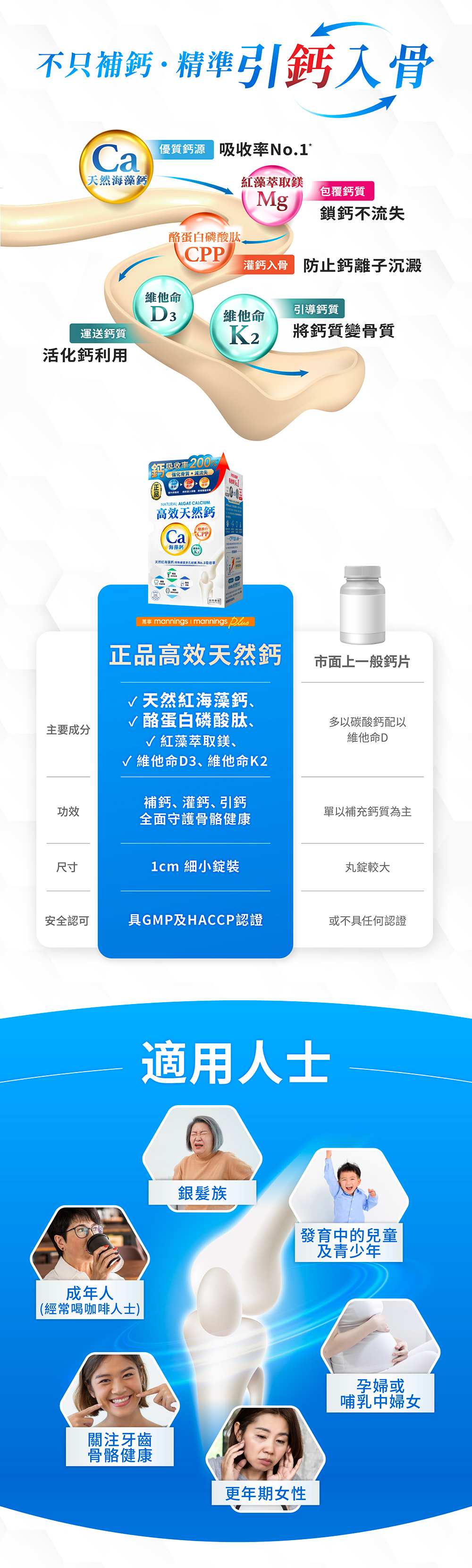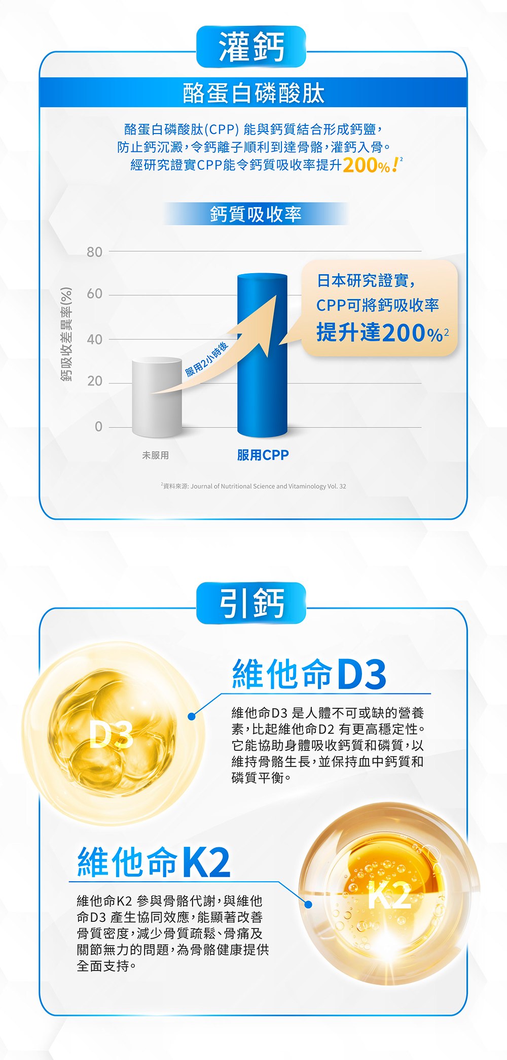 精準鈣質入骨配方︰選用獨有酪蛋白磷酸肽(CPP)、輔以維他命D3及K2產品其協同效應,將鈣質注入骨質內吸收,鎖鈣不流失。