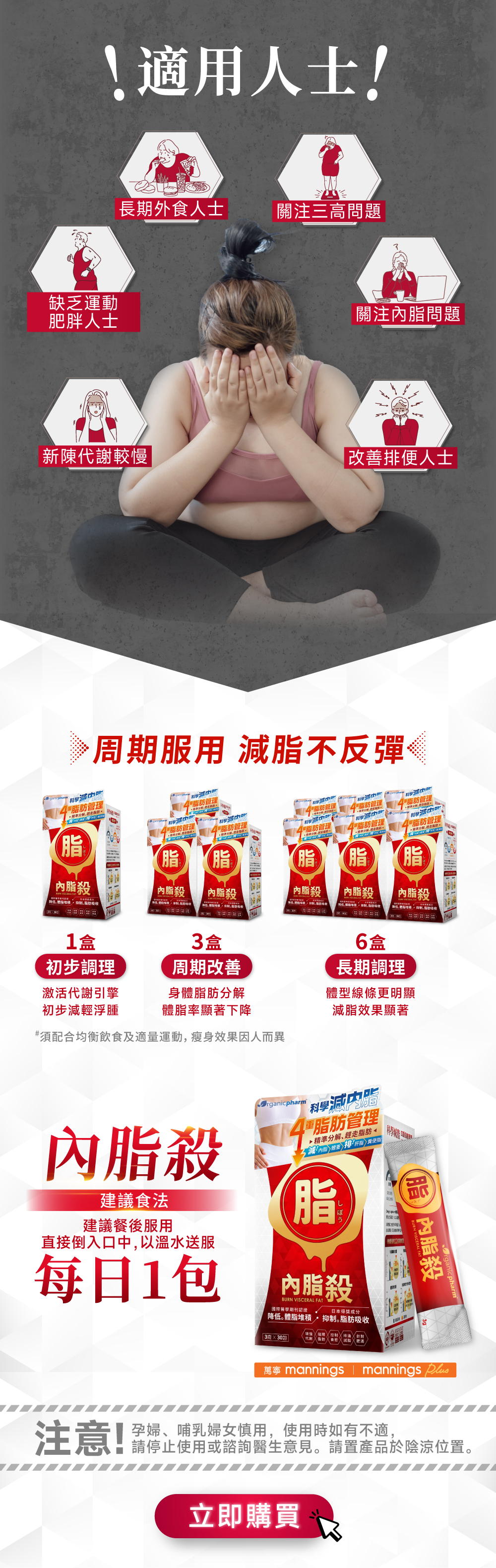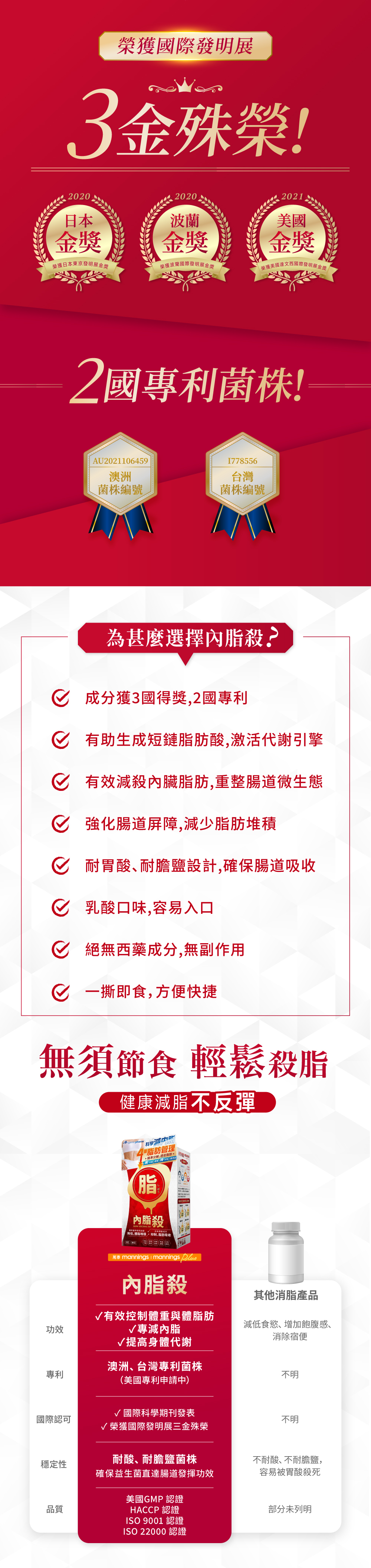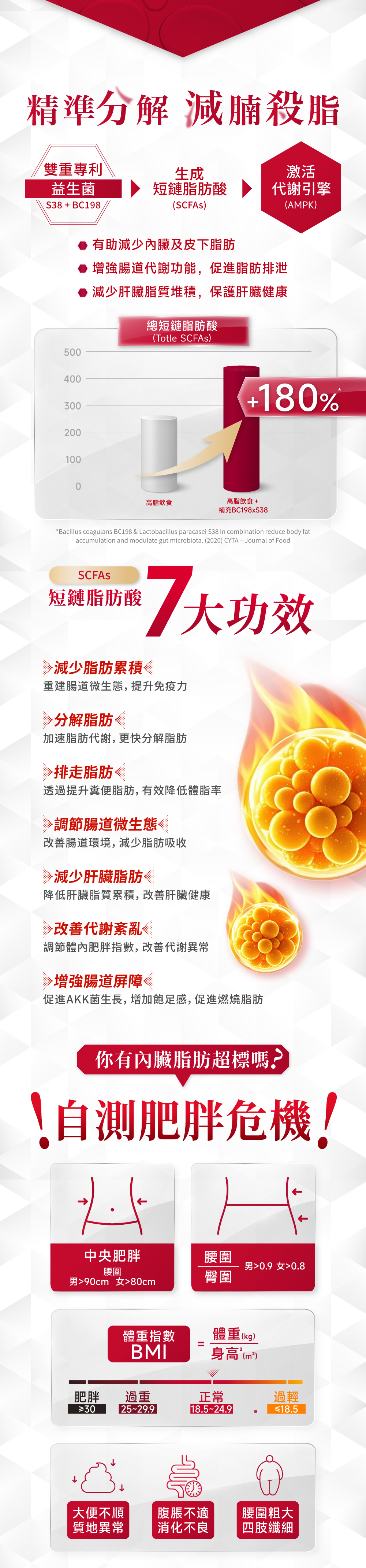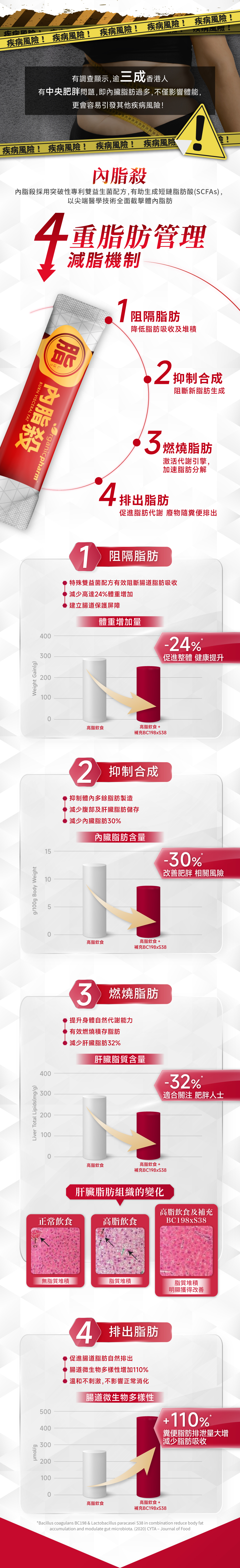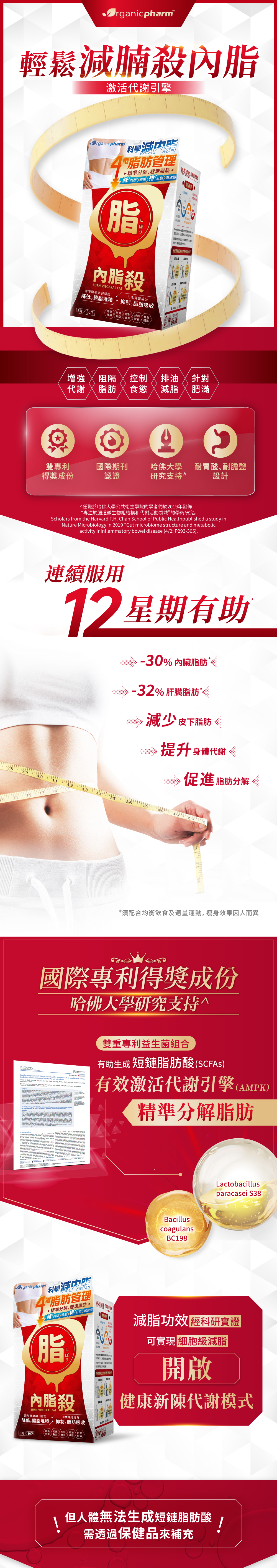「Oragnicpharm內脂殺」採用雙重專利益生菌 Lactobacillus paracasei S38和Bacillus coagulans BC198,生成短鏈脂肪酸(SCFAs),激活代謝引擎(AMPK),精準分解脂肪,將未吸收脂肪隨糞便排出,有效減殺內臟脂肪,重整腸道微生態,激活Akkermansia muciniphila(AKK)生長,強化腸道屏障,進一步減少脂肪堆積。透過菌腸軸調節,抑制食慾,減少熱量攝取。產品以科學高效減脂,透過先抑制脂肪;再促進分解與代謝;後改善腸道環境,顯著降低體脂。