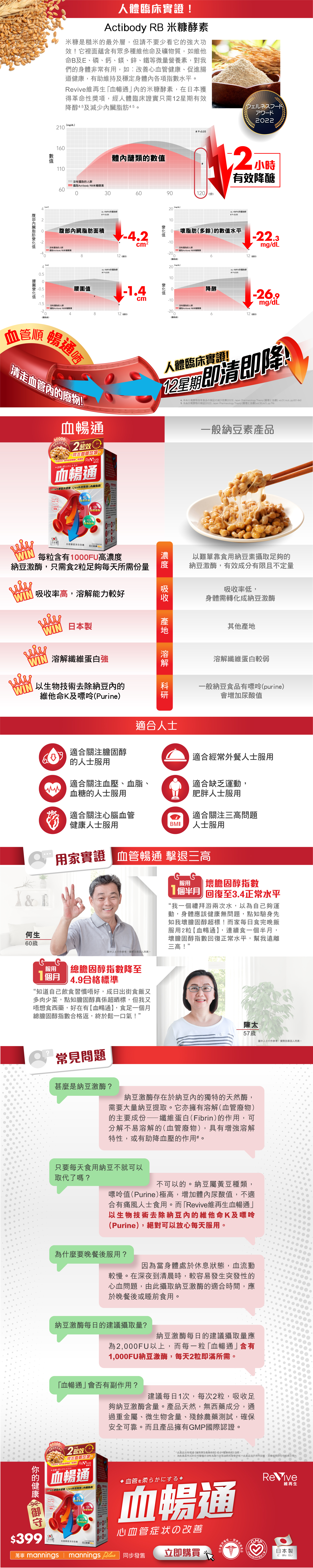 心血管問題日催年輕化,增加心血管負擔的危險因子脫離不了三高,血管提早老化,管腔內『廢物』不斷累積,使其空間收窄,形成不順不暢的情況。Revive維再生「血暢通」含有60,000FU納豆激酶,能於服用後數小時內開始分解頑固的纖維蛋白,有助掃除血管內積存的廢物。更以生物技術去除納豆內的維他命K及嘌呤(Purine),有效降低抗凝血劑的影響及減少體內產生尿酸結晶。產品加入日本得獎成分Actibody RB米糠酵素,人體臨床證實只需12星期有效降醇及減少內臟脂肪。