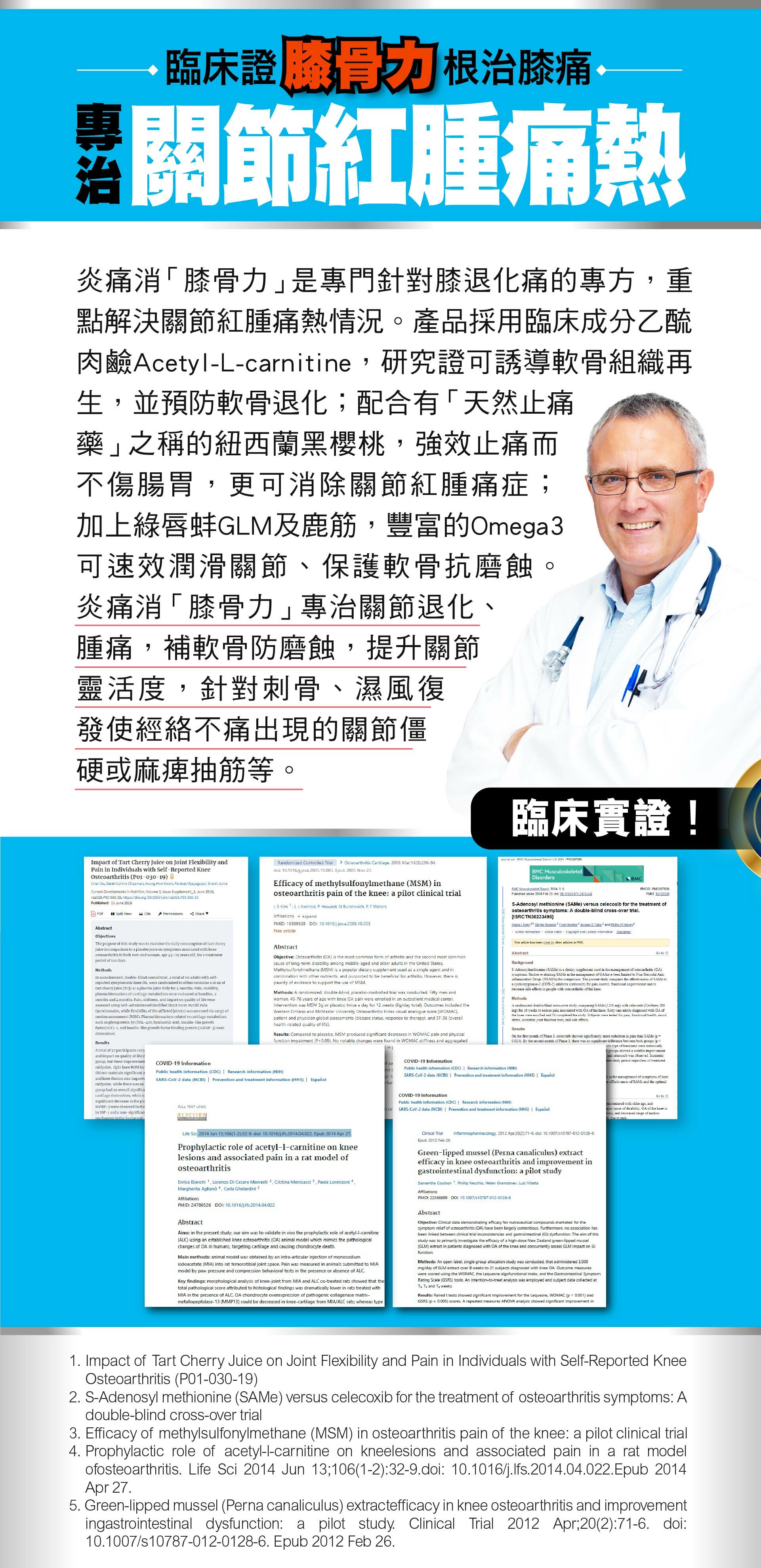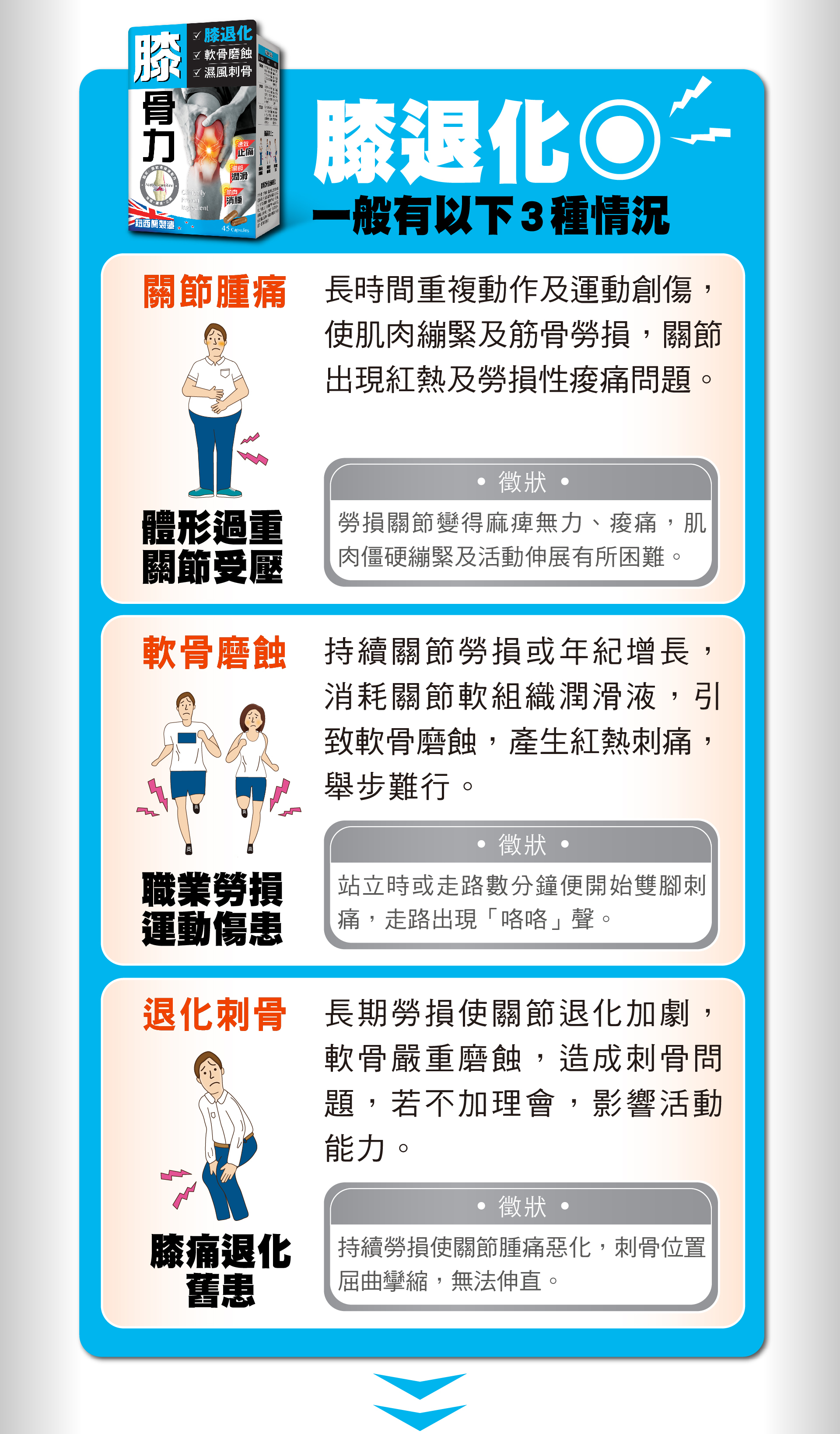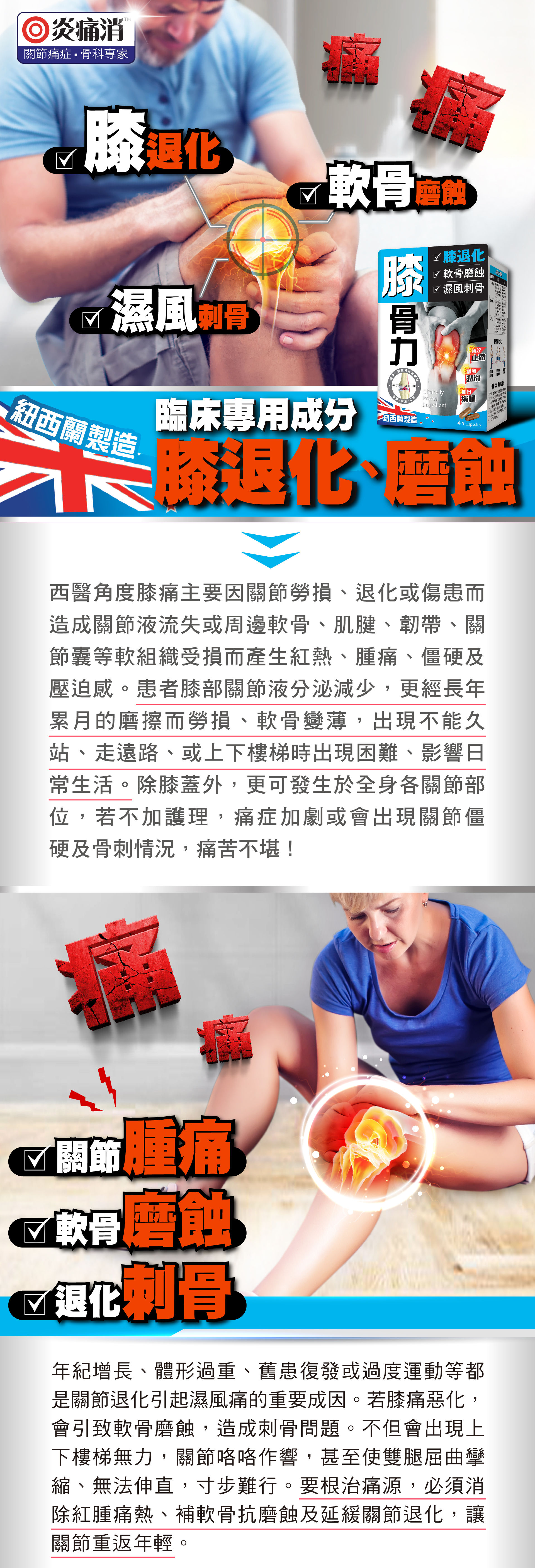 炎痛消「膝骨力」是專門針對膝退化痛的專方,重點解決關節紅腫痛熱情況。產品採用臨床成分乙酼肉鹼 Acetyl-L-carnitine,研究證可誘導軟骨組織再生,並預防軟骨退化;配合有「天然止痛藥」之稱的紐西蘭黑櫻桃,強效止痛而不傷腸胃,更可消除關節紅腫痛症;加上綠唇蚌GLM及鹿筋,可速效潤滑關節、保護軟骨抗磨蝕。炎痛消「膝骨力」專治關節退化、腫痛,補軟骨防磨蝕,提升關節靈活度,針對刺骨、濕風復發使經絡不痛出現的關節僵硬或麻痺抽筋等。